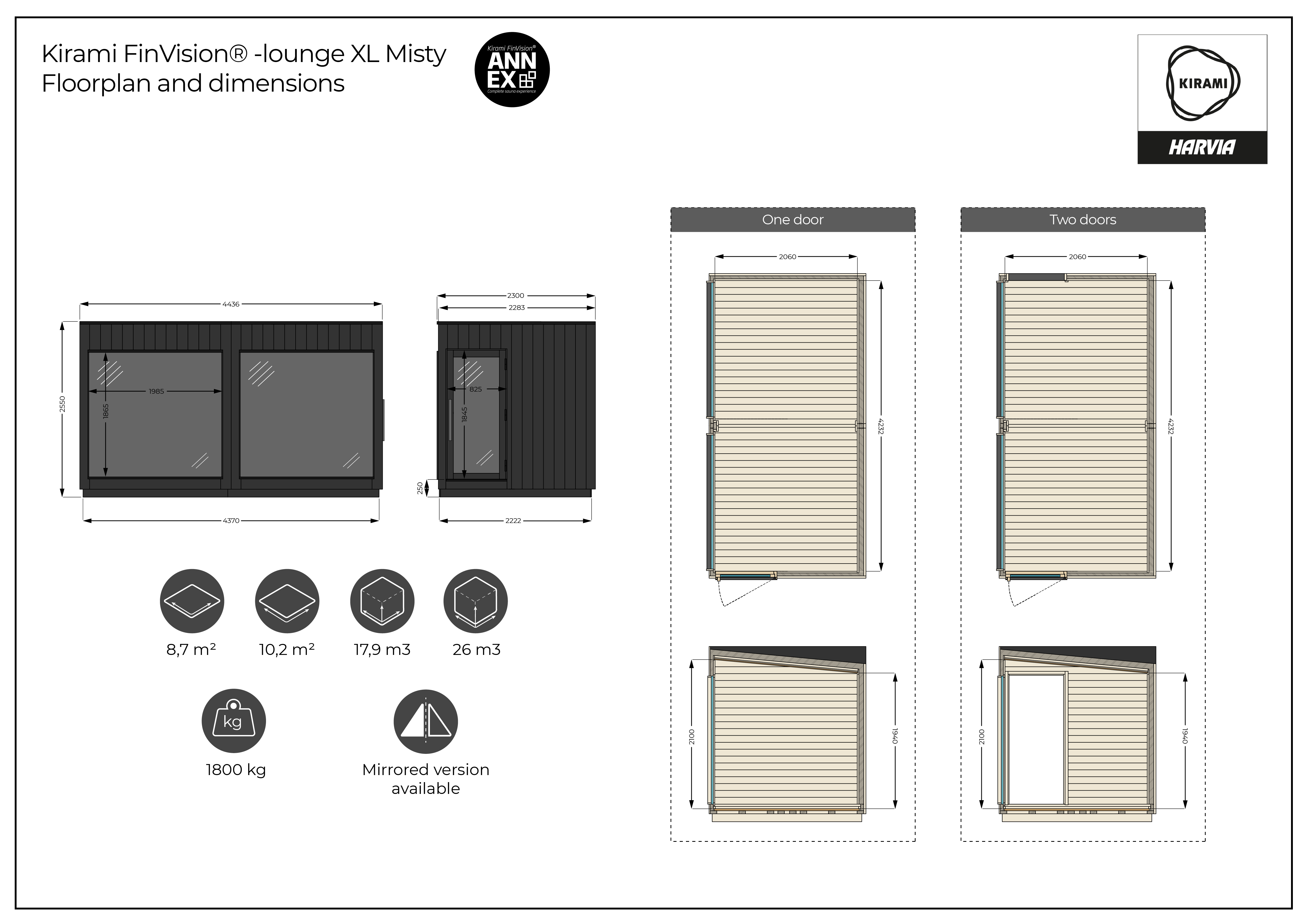 Il lounge XL Kirami FinVision® offre una vasta scelta di soluzioni per la progettazione del vostro giardino. Date libero sfogo all’immaginazione! Il lounge XL Kirami FinVision® Misty è composto da due moduli lounge pronti all’uso di dimensioni M, che vengono collegati tra loro nel luogo di installazione finale. Si integra perfettamente con gli altri moduli Kirami FinVision® Misty o può essere utilizzato come struttura indipendente. C'è spazio sufficiente per diverse soluzioni di design degli interni, a seconda dell'uso che si intende fare della struttura. Ad esempio, il lounge può essere utilizzato come area relax, foresteria o zona di lavoro da remoto. Il lounge può essere arredato con un set di divani e un tappeto Kirami FinVision® o con altri mobili a scelta.