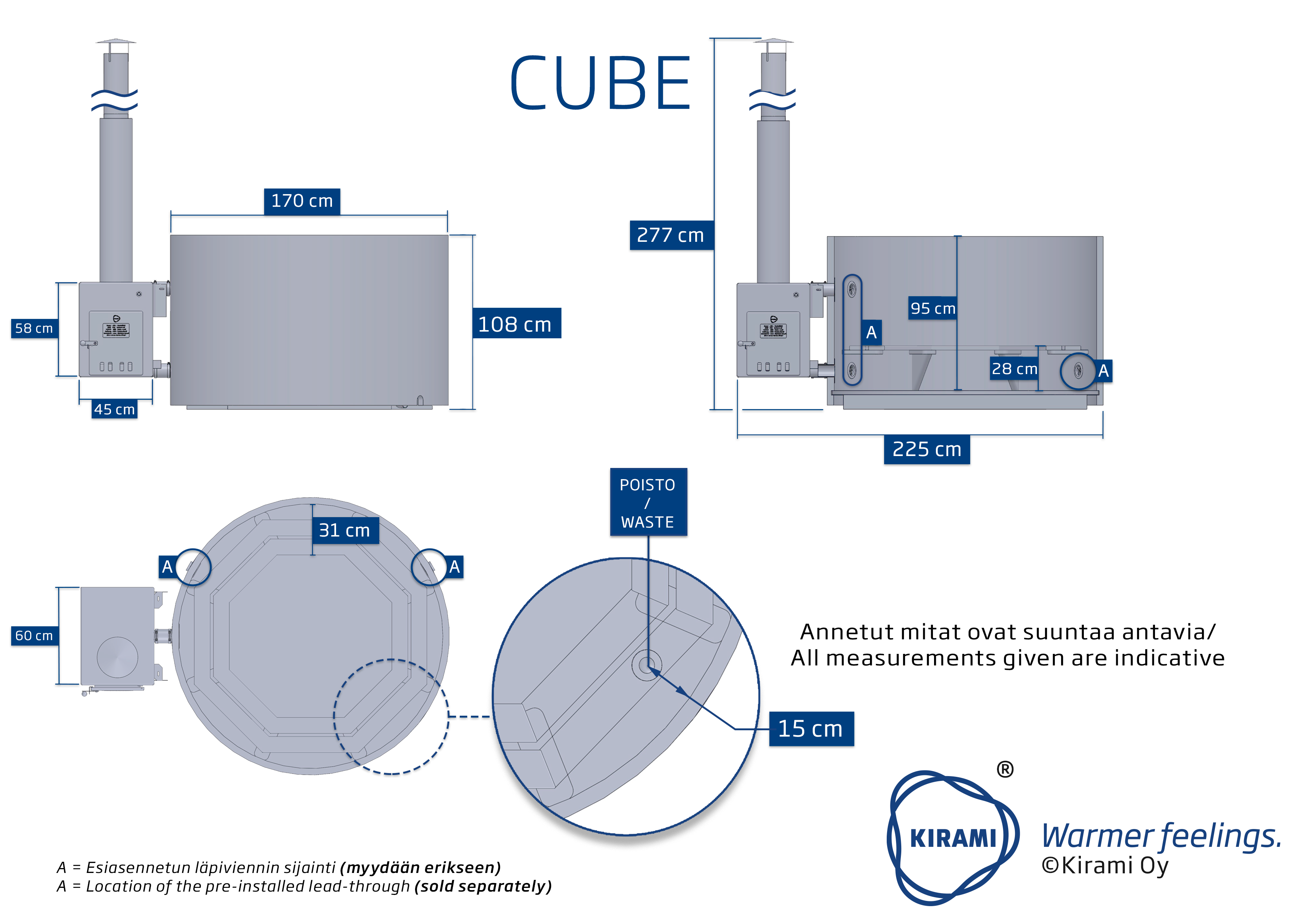 Tynnyrin halkaisija on 170 cm, vesitilavuus 1860 litraa ja se soveltuu 4-6 henkilölle. Paljun kuivapaino on 209 kg, CUBE-kamiinan bruttoteho on 48 kw ja veteen siirtyvä nettoteho 35 kw.